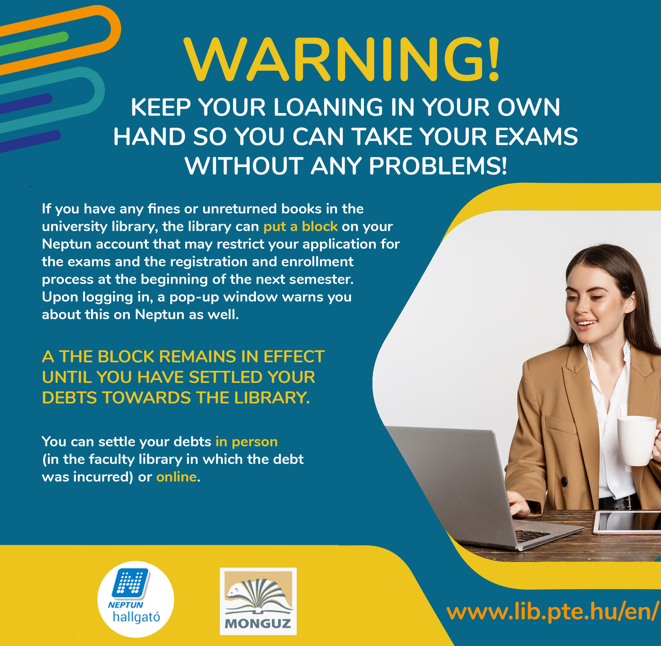 The block remains active until you have settled your debt (by paying and/or returning books that can be no longer renewed). Data between the library system and Neptun is refreshed hourly every day.