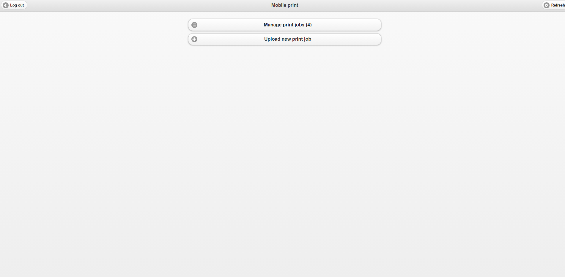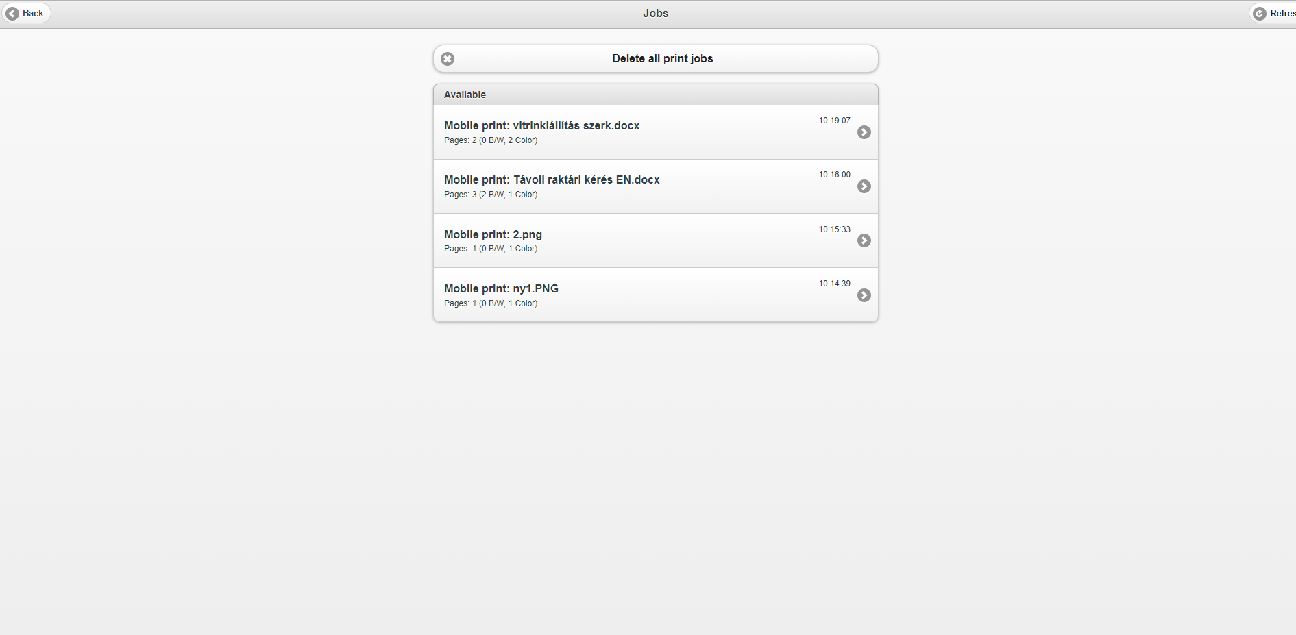 On the „Manage print jobs” button you can see in parentheses if the files are uploaded to the system –“Manage print jobs (4)”. In case of large documents, this process takes a few minutes. You can click the “Refresh” button in the top right corner to retrieve the processed documents.