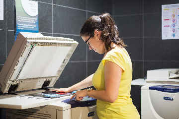 Self-service photocopying, printing and scanning are available for registered readers of the library on all levels of the building (floors 1-4). For this, first you need to upload some money to your library card with the help of one of our recharging stations (floors 1 and 2).