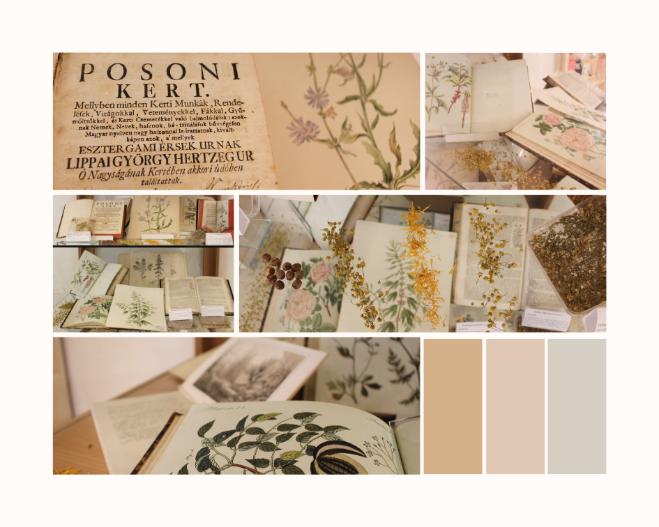 A vitrinben, gyógynövények és a Klimo Könyvtár különleges kötetei láthatóak.