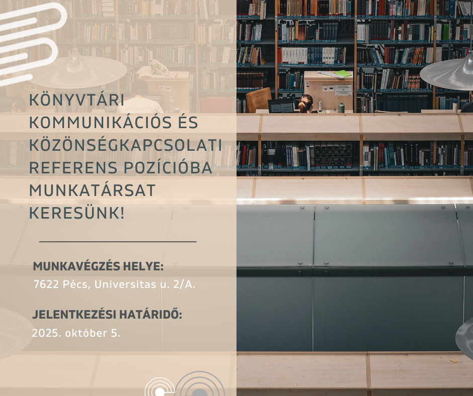 Új munkatársakat keresünk olvasószolgálati könyvtáros és könyvtári kommunikációs és közönségkapcsolati referens pozíciókba.