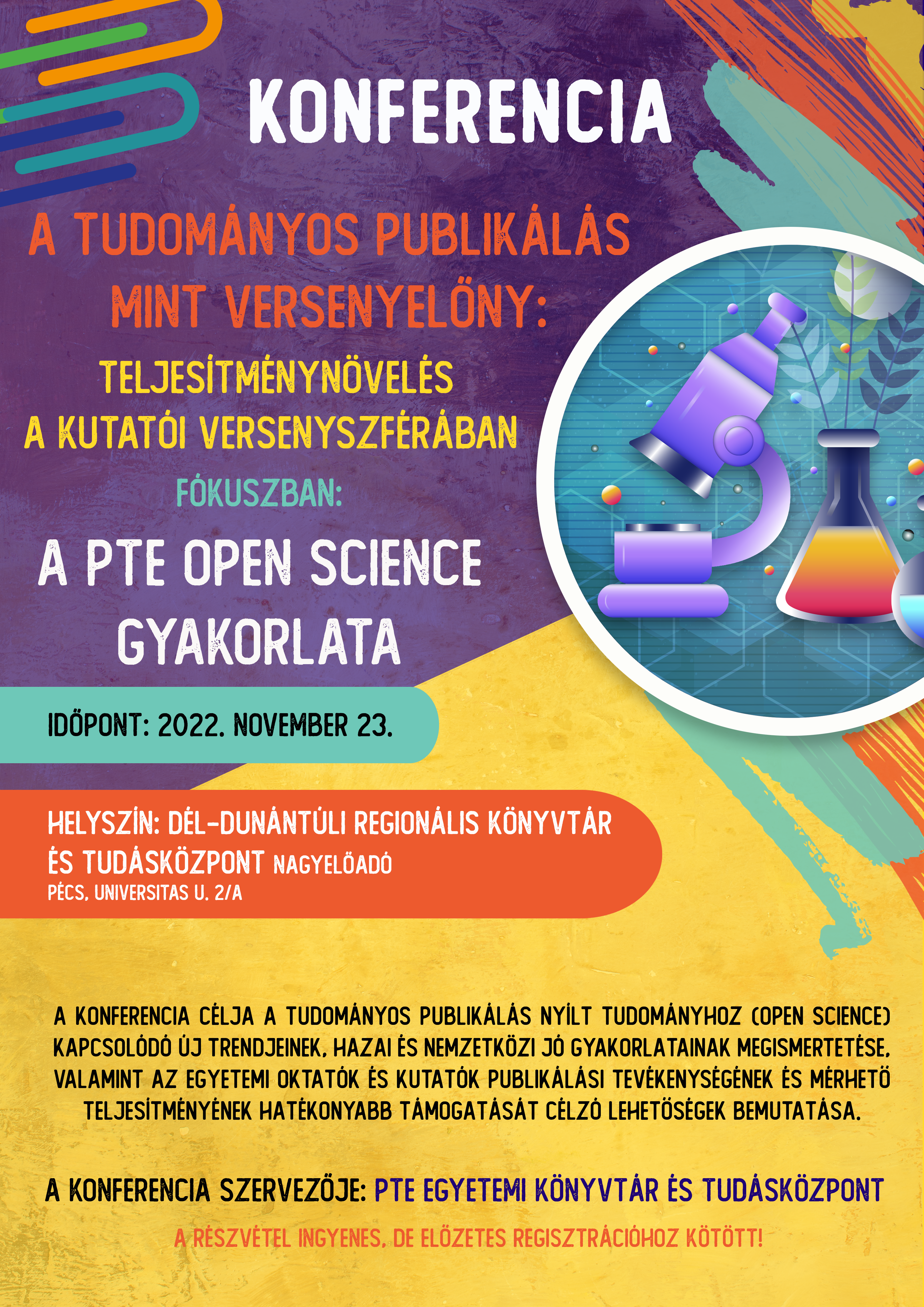 A konferencia célja a tudományos publikálás nyílt tudományhoz – Open Science – kapcsolódó új trendjeinek, hazai és nemzetközi jó gyakorlatainak megismertetése, az idevágó tapasztalatoknak a PTE közegében való jobb elmélyítése, valamint az egyetemi oktatók és kutatók publikálási tevékenységének és mért teljesítményének hatékonyabb támogatását célzó lehetőségek bemutatása. A tudományegyetemi lét hagyományosan fontos területeiről lesz tehát szó, melyek ugyanakkor az egyetemi modellváltás után a korábbinál erősebb fókuszba kerültek.