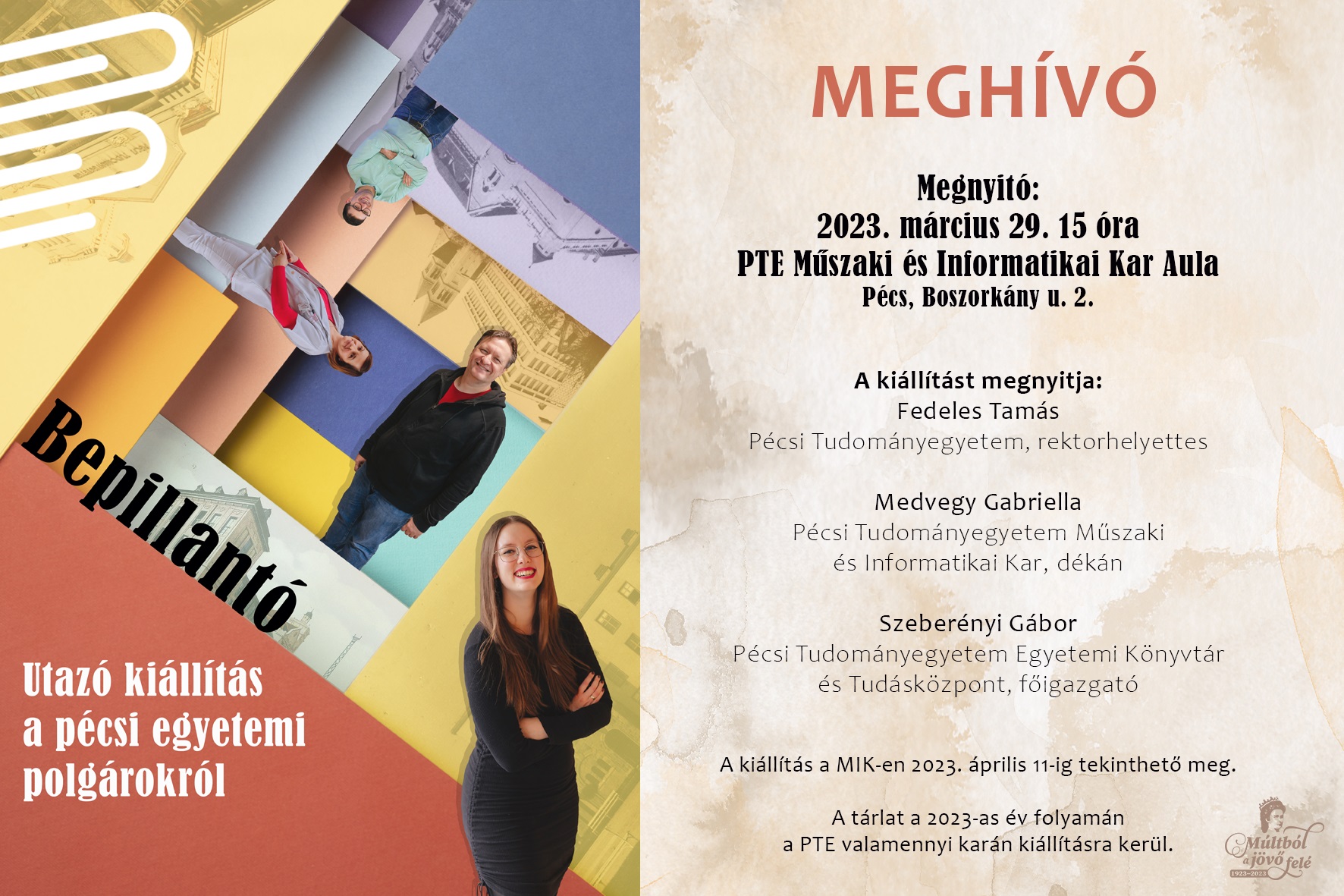 A PTE Egyetemi Könyvtár és Tudásközpont szeretettel meghívja Önt a Bepillantó – Utazó kiállítás a pécsi egyetemi polgárokról című kiállítására.