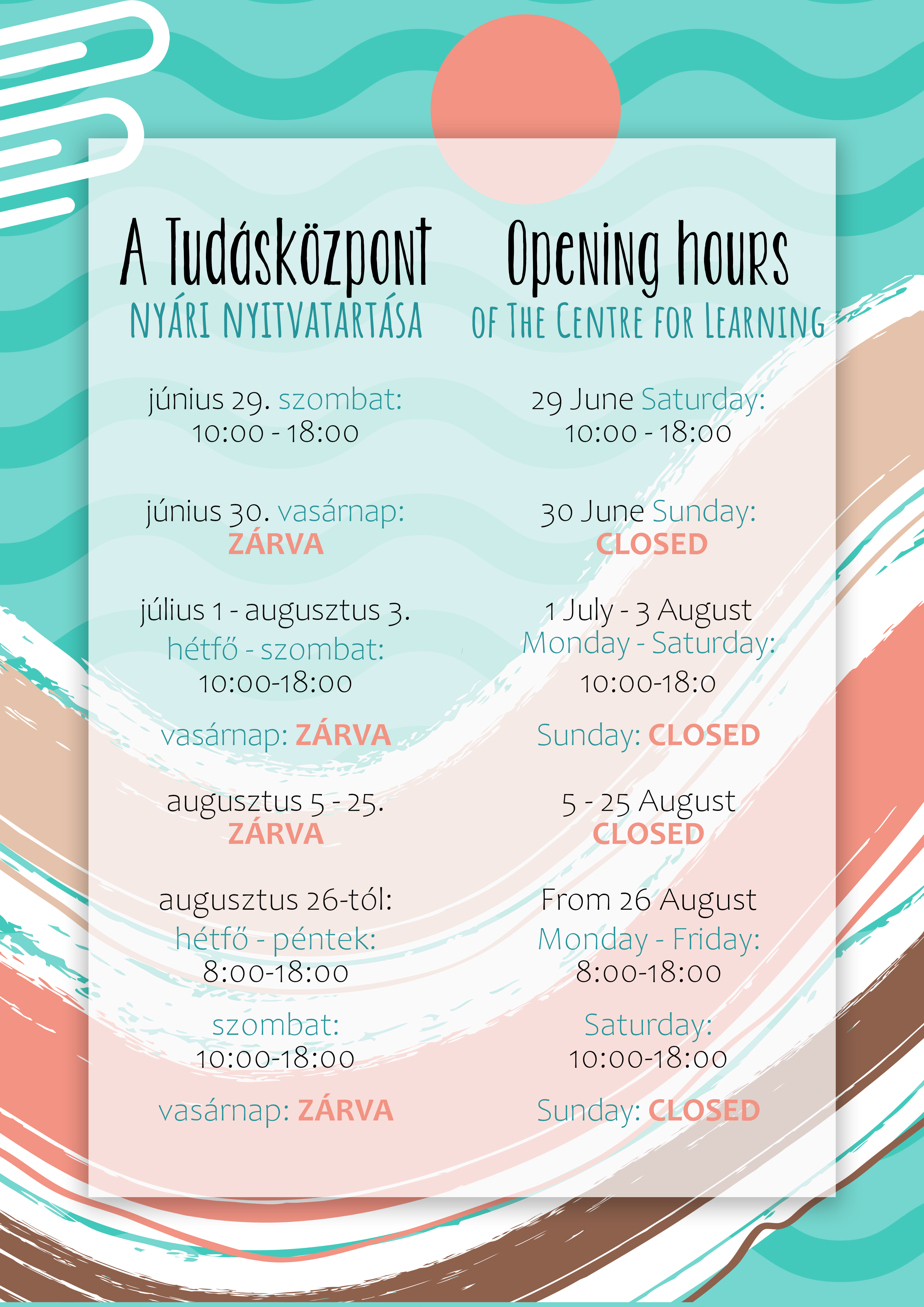 Augusztus 26-tól évközi működési rend szerinti nyitvatartás.