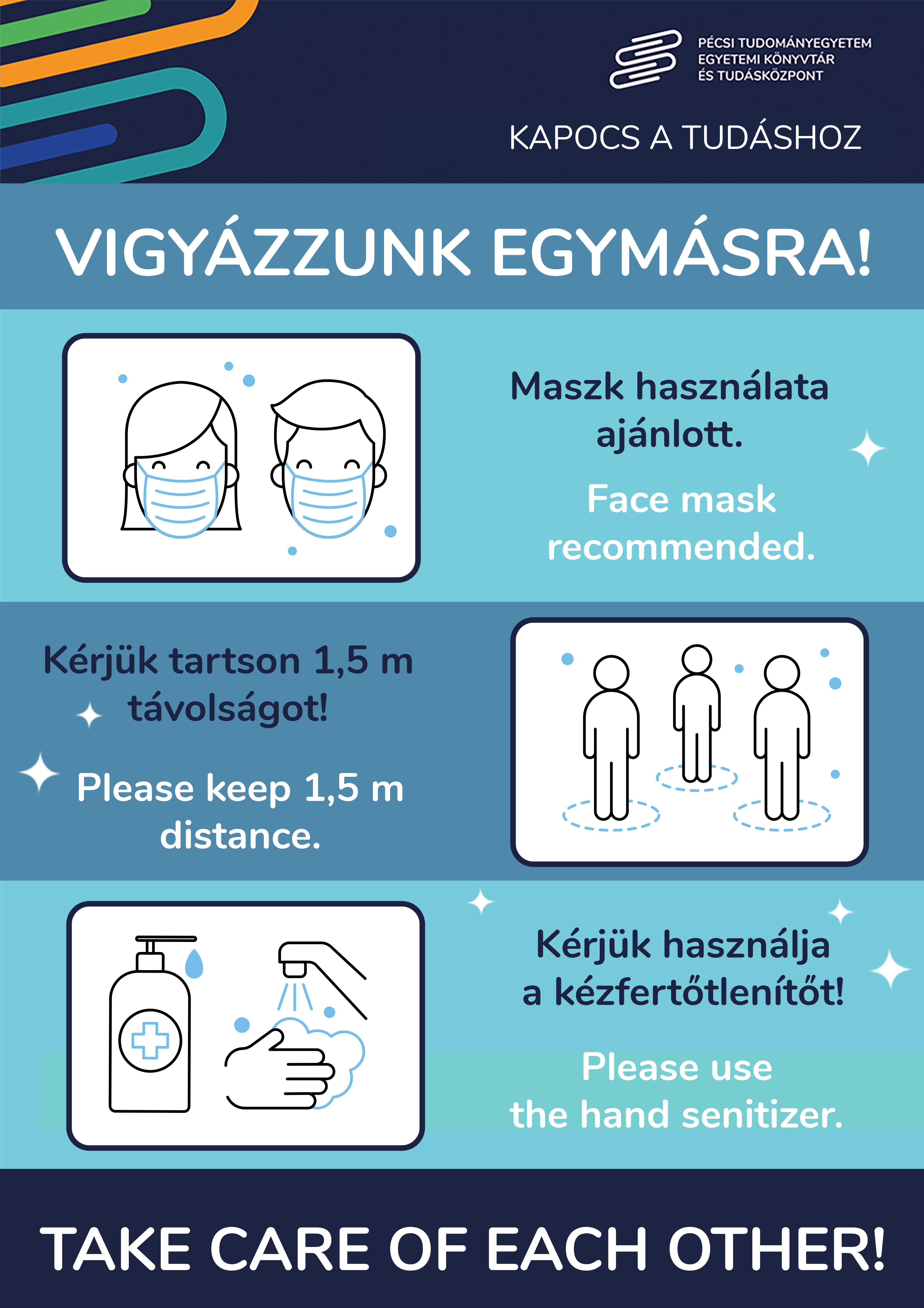 A védelmi intézkedések lépcsőzetes feloldásának harmadik fokozatára tekintettel a veszélyhelyzet idején alkalmazandó védelmi intézkedéseket szabályozó kormányrendeletek módosításáról szóló 194/2021. (IV.26.) Korm. rendelet alapján a PTE Egyetemi Könyvtár és Tudásközpont teljes hálózatának könyvtárait 2021. május 10-től ismét megnyitjuk. A vonatkozó rendelkezések értelmében könyvtárunk csak érvényes védettségi igazolvánnyal látogatható.