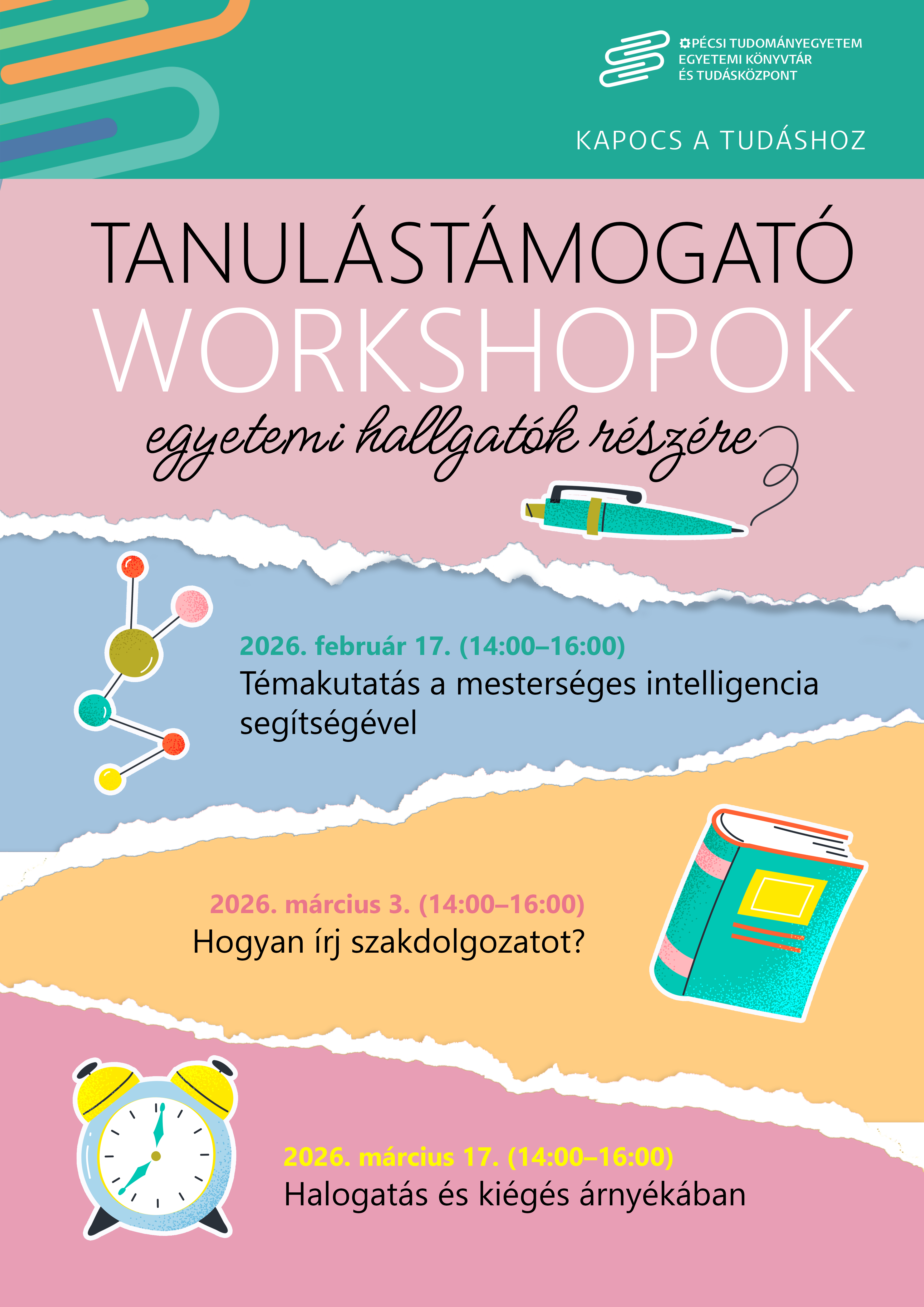 A PTE Egyetemi Könyvtár és Tudásközpont 2026 tavaszán háromalkalomból álló tanulástámogató workshop-sorozatot indít egyetemi hallgatók számára. A program célja, hogy a résztvevők átfogó képet kapjanak az online elérhető, valamint a könyvtár által biztosított tanulástámogató szolgáltatásokról és eszközökről, továbbá elsajátítsák azok tudatos, célzott és hatékony alkalmazását.